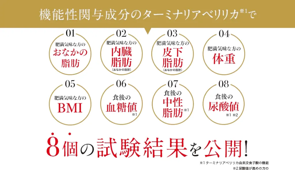 | 有効成分 | ターミナリアベリリカ由来没食子酸 | ターミナリアベリリカ由来没食子酸 + 葛の花由来イソフラボン (テクトリゲニン類として) | エラグ酸 | エラグ酸 | ブラックジンジャー エラグ酸 |