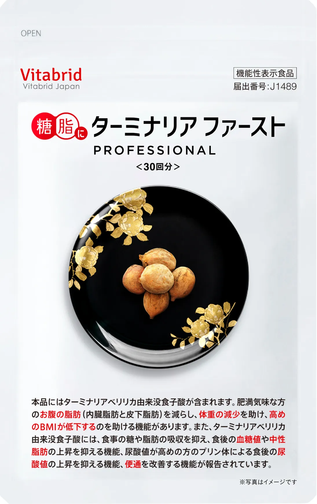 ターミナリアファースト プロフェッショナル4 機能性表示食品(届出番号 I1041) 機能性表示:本品にはターミナリアベリリカ由来没食子酸が含まれます。本品は、肥満気味な方のお腹の脂肪(内臓脂肪と皮下脂肪)を減らし、体重が減少するのを助け、高めのBMIが低下するのを助ける機能があります。また、ターミナリアベリリカ由来没食子酸には、食事の糖や脂肪の吸収を抑え、食後の血糖値や中性脂肪の上昇を抑える機能、尿酸値が高めの方の食事のプリン体による食後の尿酸値の上昇を抑える機能が報告されています。