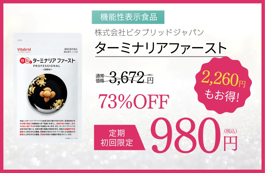 1)2026年1月当サイト経由の販売数におけるランキング2)葛の花由来のイソフラボン(テクトリゲニン類として)*3)エネルギー消費 *4)肥満気味の方の 5)ターミナリアベリリカ由来没食子酸の機能6)尿酸値が高めの方の *7)内臓脂肪と皮下脂肪 *8)葛の花由来のイソフラボン(テクトリゲニン類として)*9)ビタブリッドジャパン負担につき、初回送料無料 *10)通常購入価格のことを指しキャンペーンを適用しない場合の単品購入価格です。